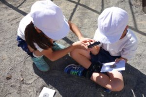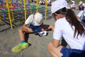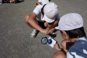 今日は、雲もなく良い天気の中、理科の実験を行いました。課題は「虫めがねを使って、紙をこがすことができるか。」です。児童は、ペアの友達と協力し、虫めがねを上手に使って、日光を集め、紙をこがすことができました。