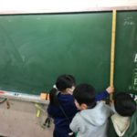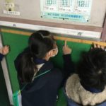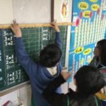 算数の「長さをはかろう」の単元の学習で、1mものさしを使っていろいろな場所の長さをはかる活動を行いました。