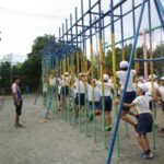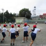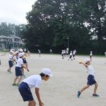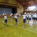 3年生は表グランドでおにごっこを、4年生は第2グランドでボール投げを、5年生は体育館で体つくり運動を、6年生は表グランドでのぼり棒を、