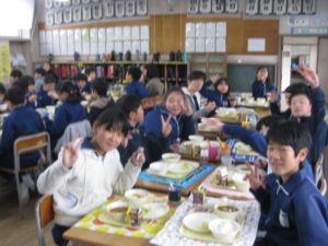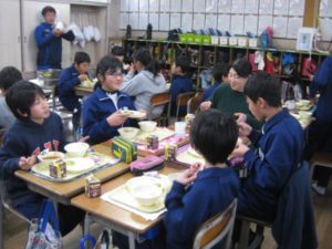 ふれあい教室5日目は、5年生が調理員さんと一緒に給食を食べました。 調理員さんを囲んで、楽しく給食が食べられているようでした。