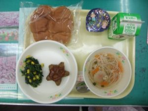 ◯今日の給食 牛乳 バターロール 七夕ビーフンスープ 星のハンバーグ ほうれん草のソテー お星さまゼリー 「七夕メニュー」です。七夕には、「そうめん」を食べる風習がありますが、給食では、のびにくい ビーフンを使用したスープにしました。