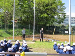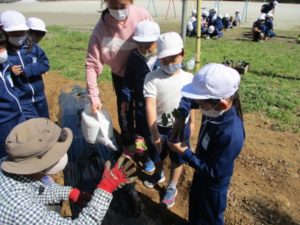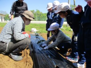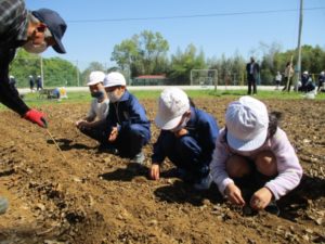 4月27日(火)の1時間目に生活科の学習で畑名人の先生に来ていただきました。 先生に教えていただきながらきゅうりの苗植えとポップコーン用のトウモロコシの種をまきました。 子どもたちは両手でとても大事そうに苗をもったり、種をもったりしていました。 これから毎日日直さんが水やりをしながらみんなで成長を観察することになりました。 美味しいきゅうりやポップコーンが食べられるのが楽しみです。