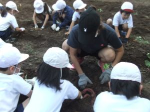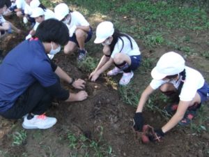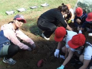 秋晴れのいいお天気の中、1年生、2年生、かしの木さんで、畑の名人本橋さんに教えていただきながらサツマイモ掘りをしました。 畑の中からは子供たちの歓声とともにおいしそうなお芋がゴロゴロ出現。大豊作でした。 他にもいろいろな生き物を発見したり、土の感触を楽しんだり、 秋の収穫を体いっぱいに満喫できました。