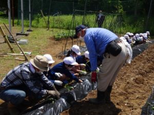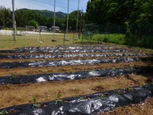 5月10日(火)、五月晴れのいいお天気の中、1・2年生、かしの木学級で畑に野菜の苗を植えました。 畑の名人、本橋さんと笠原さんに来ていただき、事前にふかふかにしてもらった畑にサツマイモ、キュウリ、ナスを植えました。今年は「コンパニオンプランツ」と呼ばれるネギも一緒に植えました。大切な作物を害虫から守ってくれる役割を果たしてくれるそうです。 「いつになったらおいもがとれますか?」と子供たちから名人さんに質問が出るほど、今から実りの秋が楽しみです。それまで心をこめて一生懸命お世話をしていきます。
