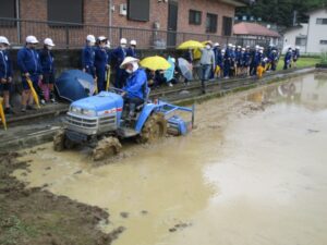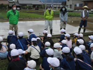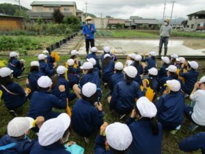 代掻きの見学をしました。 名人さんが代掻きをし、なぜ代掻きを行うのか教えてもらいました。