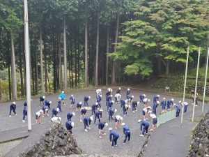 宿泊学習2日目、天気はくもり、朝ののつどいからスタートです。