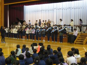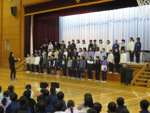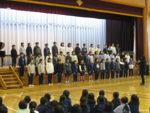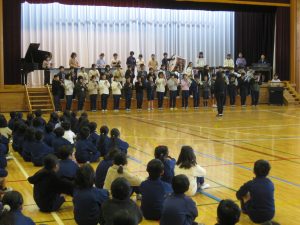 今日の音楽朝会は5年生が担当しました。 キリマンジャロを合奏し、マイバラードを合唱しました。 5年生は今日まで練習した成果を十分に発揮し、体育館に楽しい音が響きわたりました。 退場のときにも、他の学年の児童がマイバラードを小声で口ずさみながら体育館をあとにしていきました。