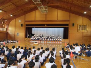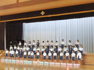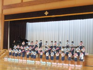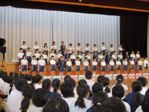 今日の音楽朝会は2年生の担当でした。 『山のポルカ』は鍵盤ハーモニカの難しい指づかいをすらすらと演奏し、『いるかはざんぶらこ』は打楽器を合わせてリズムよく歌うことができました。 また、『帰りの会のサンバ』を振りつけをして、全校で楽しく歌いました。朝から楽しい気分になり、1日のよいスタートとなりました。