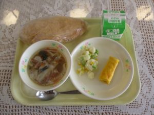 今日の給食は(牛乳、きなこ揚げパン、わんたんスープ、ウィンナー卵焼き、ミックスポテト)でした。揚げパンは、子どもたちも先生方も好きなメニューです。ココア味ときなこ味を出していますが、両方とも人気があります。寒い時期は、温かいスープ類がおいしいですね。