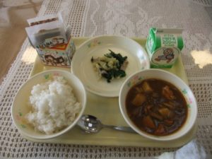 今日の給食は(牛乳、麦ご飯、チキンハヤシシチュー、カリフラワーとハムのサラダ、チョコレートケーキ)でした。今日は2学期の給食最終日です。2学期の給食は8月25日からでしたが、予定通り本日最終日となりました。もうすくクリスマス、そして、冬休みです。バランスよく食べて、元気に楽しく過ごしましょう。