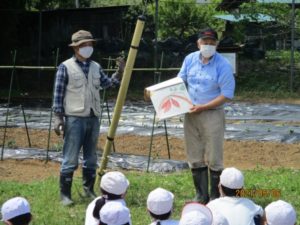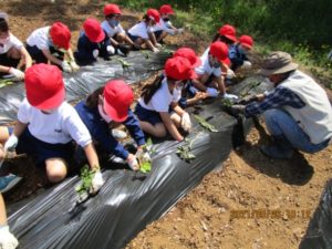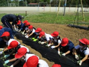 GW明けの五月晴れの広がる5月6日に畑の名人さんをお招きして1・2年生がさつまいもの苗植えをしました。 畑の名人さんが準備してくれた「うね」に一人一人が苗を大切に心をこめて植えていました。
