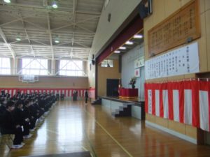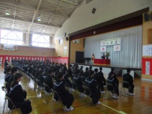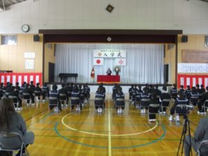 新型コロナウイルス感染防止のため縮小して行いました。 このような状況でしたが、新入生紹介では大きな返事ができていました。大いなる活躍が期待できる中学校生活のスタートとなりました。