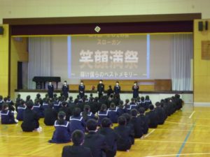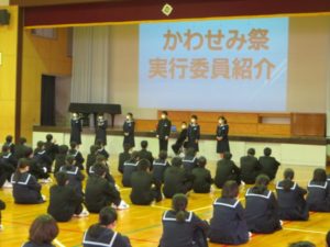 10月25日、生徒朝会があり、文化祭(かわせみ祭)の実行委員やスローガンの紹介、クイズ等を行いました。