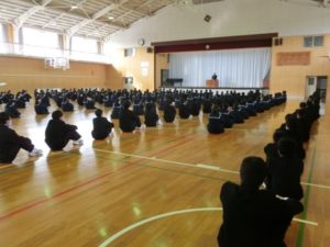 11月8日、全校朝会がありました。学校長が、プロサッカー選手の長友佑都さんを題材に「努力を続けることの大切さ」を全校生徒に語りました。