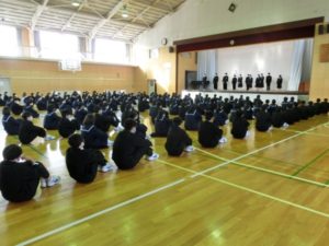 11月29日、生徒朝会を行い、後期生徒専門委員会委員長の自己紹介やベルマーク収集の依頼がありました。