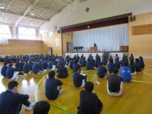 3月31日、転退職教職員とのお別れの会がありました。代表生徒が転退職教職員へ花束を贈呈した後、転退職教職員がお別れのことばを1,2年生に語りました。