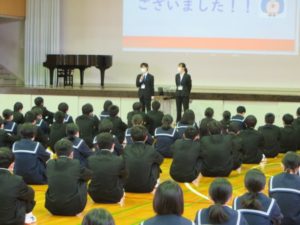 学級委員による生徒朝会が行われました。各クラスの良い点や課題、課題を解決するための方策などの発表がありました。さらによいクラスとなるよう中心となって頑張ってください。また、教育実習生の紹介も行われました。3週間よろしくお願いします。