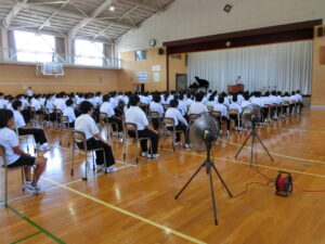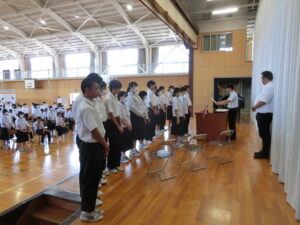 7月20日、1学期終業式が体育館で行われました。各学年代表者が1学期の反省を発表した後、学校長が1学期の成果(あいさつ等)や課題(交通マナー等)を述べるとともに、生成AI活用の注意点等について話をしました。式後には、学校長が学校総合体育大会地区予選会等の賞状伝達を行ったり、各担当者が夏季休業中の過ごし方や部活動、交通安全、健康・保健等の諸注意について説明したりしました。