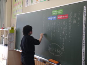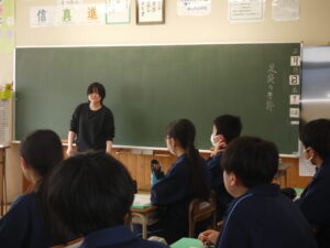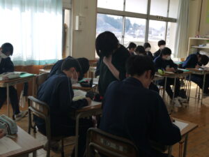 2月15日(木)、道徳の授業が2年2組でありました。今年度は学級担任だけでなく、学年の教職員が各学期1回授業を行うことになっています。「足袋の季節に」という内容を行いましたが、生徒もよく考え発表していました。ここで学習したことを日頃の生活にも生かしていってほしいと思います。