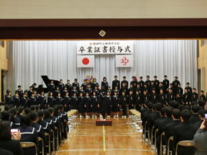 3月15日、来賓・保護者・教職員及び1,2年生が見守る中、第77回卒業証書授与式が挙行されました。式辞では、学校長が進化論を唱えたダーウィンの言葉「生き残るのは一番強い種族でも一番賢い種族でもない。変化に適応する能力が一番高い種族が生き残る。」を題材に柔軟な発想の重要性を卒業生に語りました。感謝の言葉や歌声が溢れ、心温まる感動的な式となりました。式後には、保護者とともに全員で卒業生を見送りました。