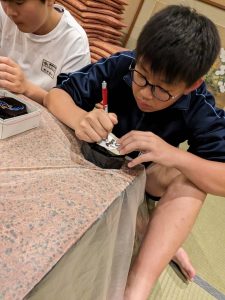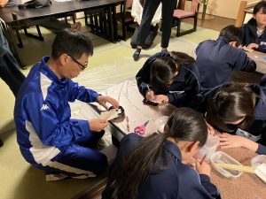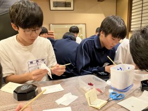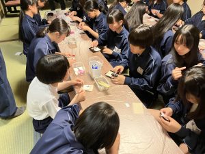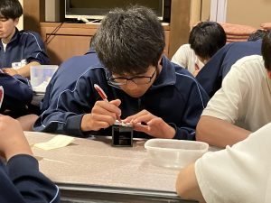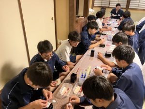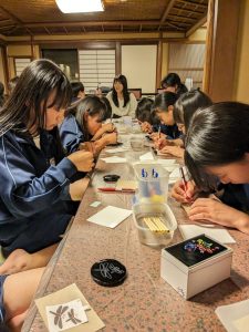 20時より漆器の加飾体験を行なっています。自分たちで決めた下絵を描き、次に銀色でその下絵を塗り、その後、各色を4回ほど重ねていきます。最後に金色を塗って完成になります。修学旅行の思い出に自分たちで作ったものを使っていけるようにしてくださいね!校長先生も参戦中です!