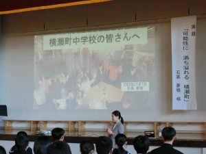 11月7日(金)に、PTA主催による「ふれあい講演会」を行いました。 講師は、横瀬町の町おこし協力隊の先駆けとしてご活躍された、石黒夢積様です。 石黒様が、なぜ町おこし協力隊として横瀬町に移住なされたのか、幼少期はどんな子供だったのか、人生の岐路に立たれた時のことなど、その時々の気持ちや考えを丁寧に、分かりやすくお話しいただきました。また、日頃の生活ではなかなか気が付きにくい「横瀬町の魅力」についても、お話しいただきました。生徒にとって、これからの生き方や進路を考えるうえで、参考になる部分がたくさんあったと思います。 準備に当たっていただいたPTAの皆様、そして講師の石黒様、本日はありがとうございました。