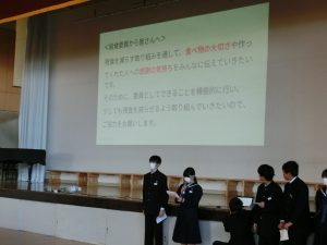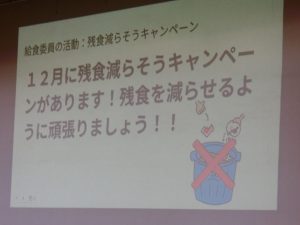 11月17日(月)の朝は、生徒朝会を行いました。今回の主催は給食委員会でした。 給食委員会のおもな仕事内容や、12月に予定している「残食減らそうキャンペーン」の取り組み、食にまつわるクイズ、11月の彩の国ふるさと学校給食月間の紹介など、盛りだくさんの内容でした。 みんなで楽しく給食の時間を過ごせるよう、給食委員の皆さんも頑張っています。給食に係わっていただいている皆様への感謝の気持ちも忘れずに、これからも充実した給食の時間を過ごしていきましょう。